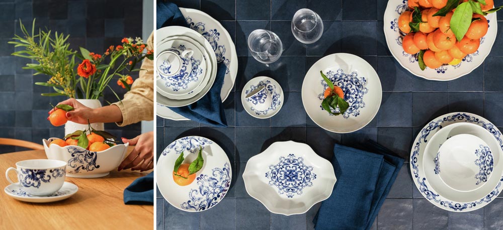 The white and blue décor features a floral pattern that fades at the edges.